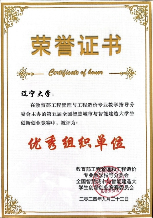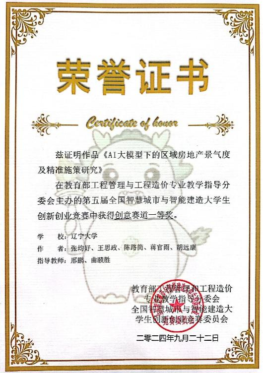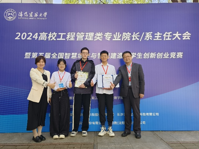 2024年9月21日至22日,由教育部工程管理和工程造价专业教学指导分委员会主办的第五届全国智慧城市与智能建造大学生创新创业竞赛在沈阳建筑大学举行。星空XK体育邢鹏老师和系主任曲赜胜老师共同指导的,由工程管理专业(张均好、王思政、陈路简)及管理科学与工程专业(胡远康、蒋官雨)五位同学组成的代表队,以真实问题为导向,撰写的《AI大模型下的区域房地产景气度及精准施策研究》作品,经过多轮的专家网上函评和线下答辩,从全国38所高校近50支精英队伍中脱颖而出,继2019年斩获首届比赛全国一等奖后,星空XK体育官方网站代表队再次勇夺全国一等奖。同时星空XK体育官方网站还被授予“优秀组织单位”奖。